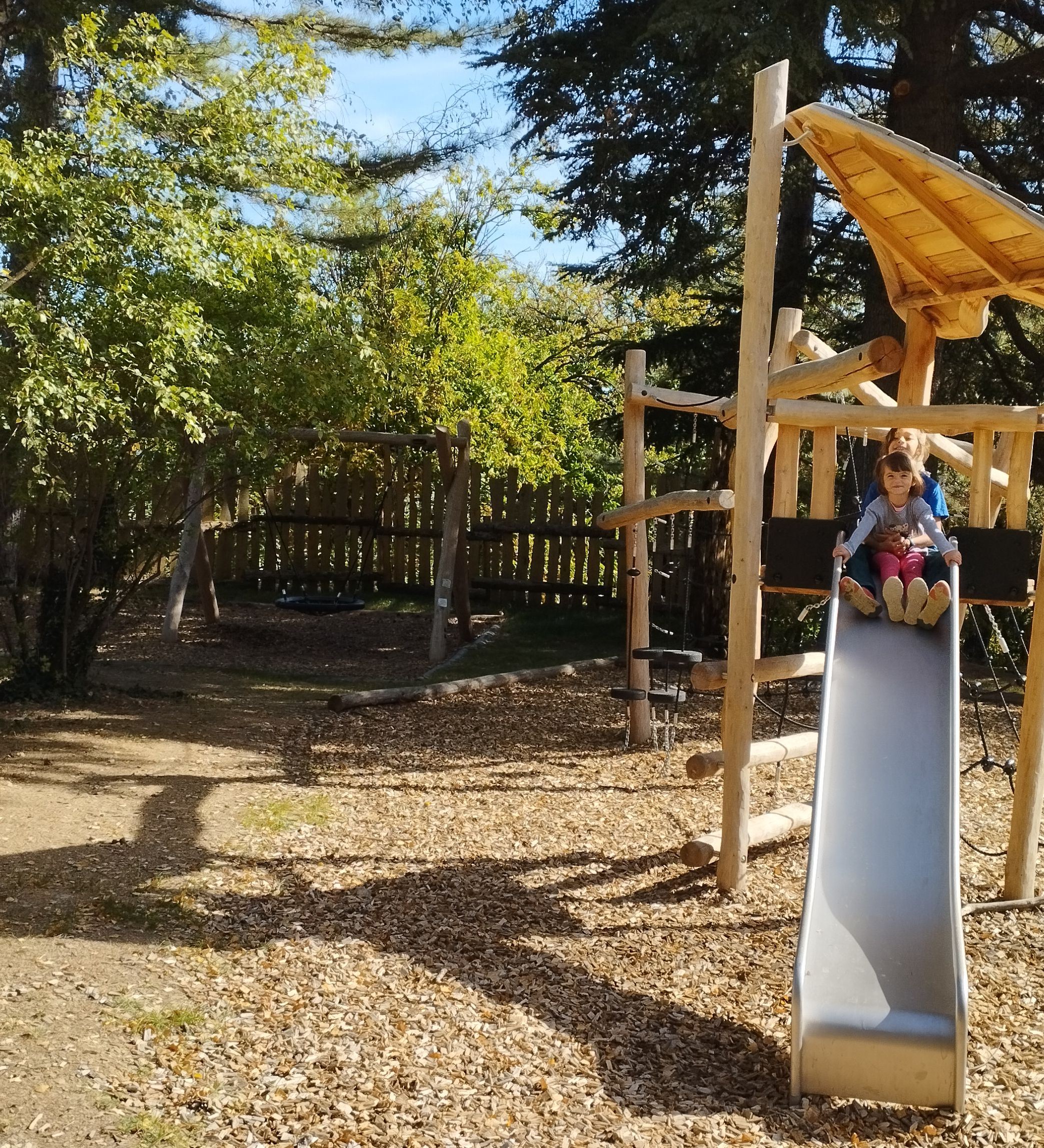 A l'ombre des bouleaux, le village des enfants propose un parc de jeux complet, avec espace de grimpe, toboggans, 3 types de balançoires pour s'adapter à tous les âges, et bien d'autres modules de jeux.