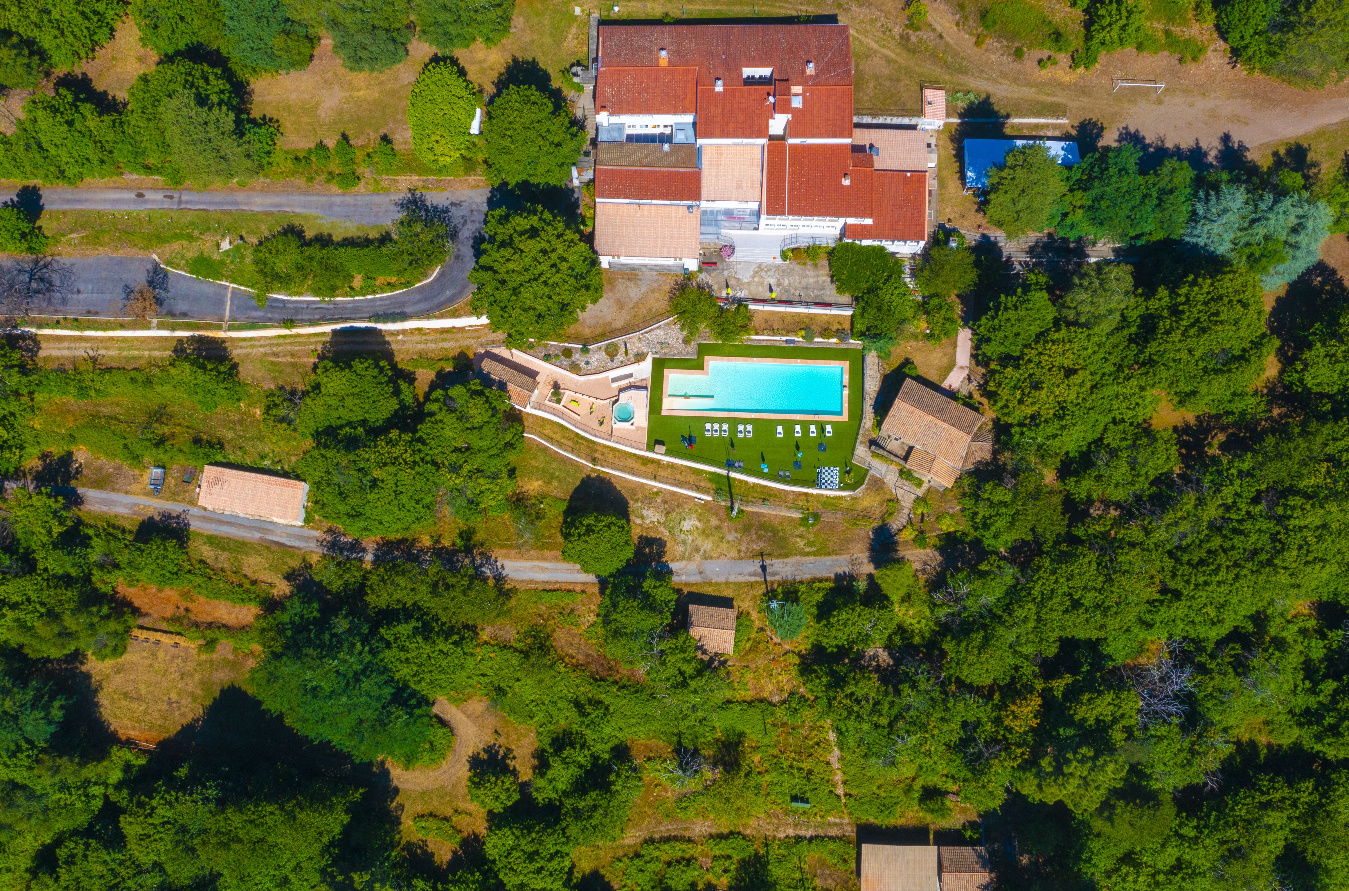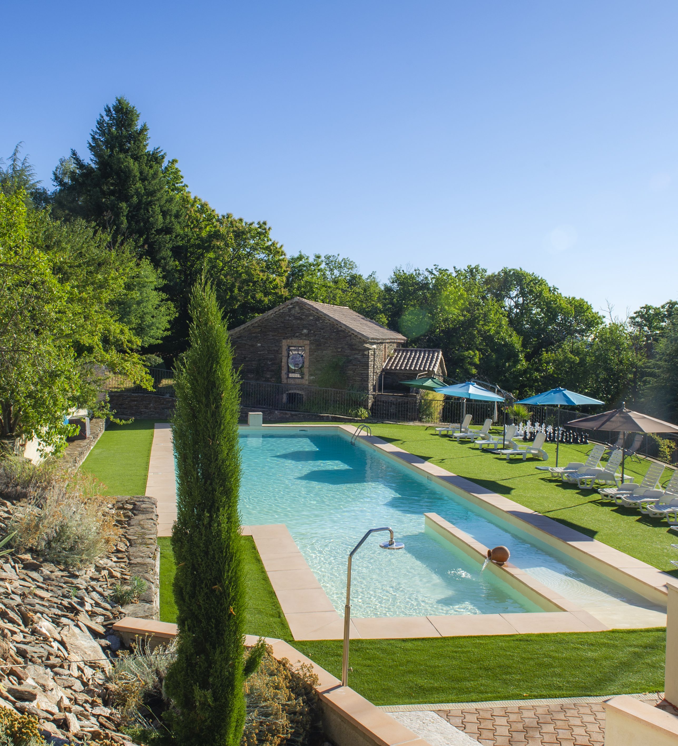 Pour la détente ou l'amusement, profitez de sa plage engazonnée, ses chaises longues et transats à l'ombre de la tonnelle en bois, et bien sûr, de son jacuzzi 8 places qui partage, avec les équipements de remise en forme, une vue imprenable sur les vallons des Cévennes.