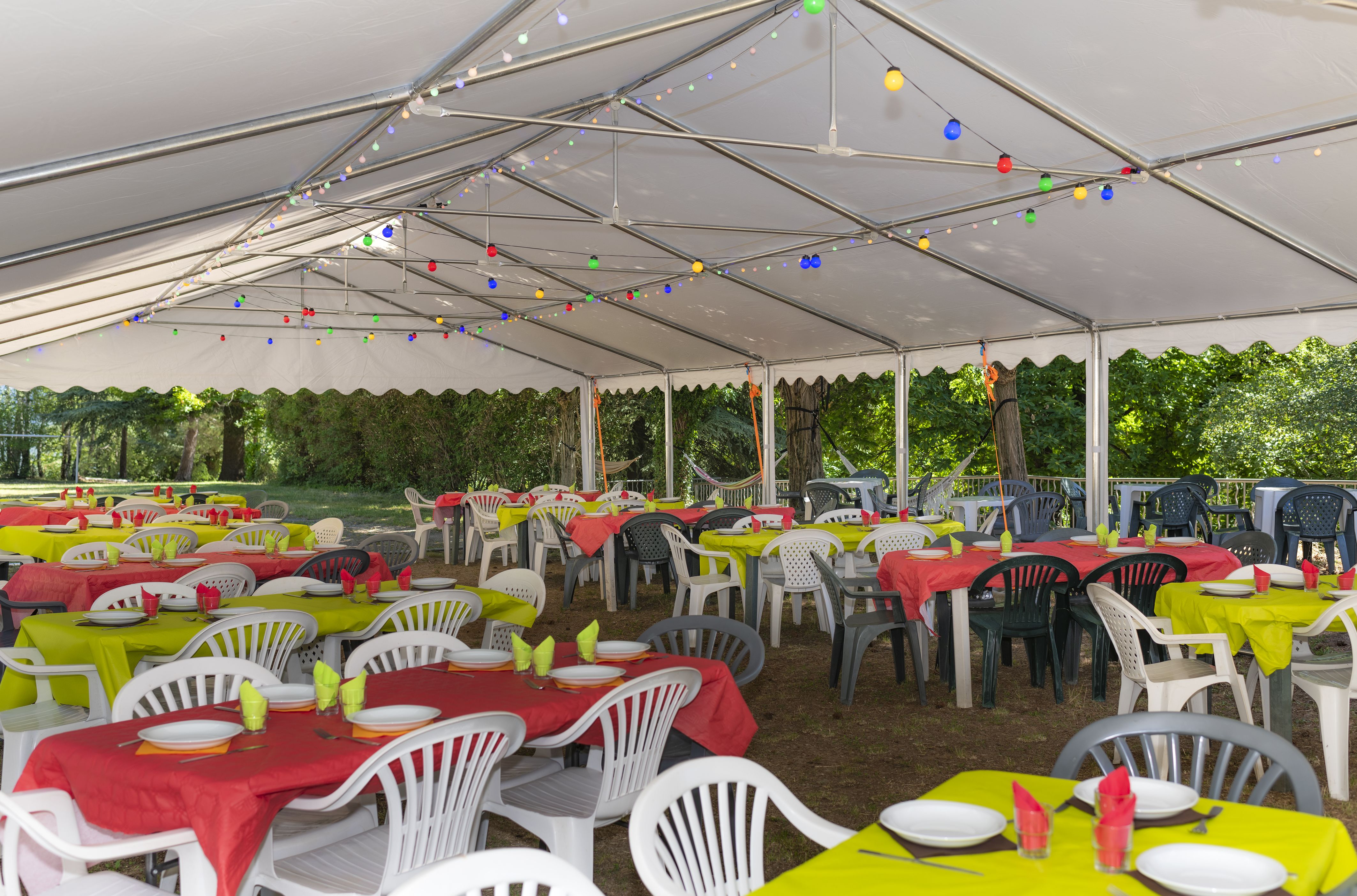 Complété par une scène de 10m² propice à recevoir des musiciens ou des orateurs, cette véritable tente de réception proche du parc de jeux et des cuisines peut être complétée par les espaces de restauration intérieurs pour permettre une capacité de restauration totale de 200 personnes.